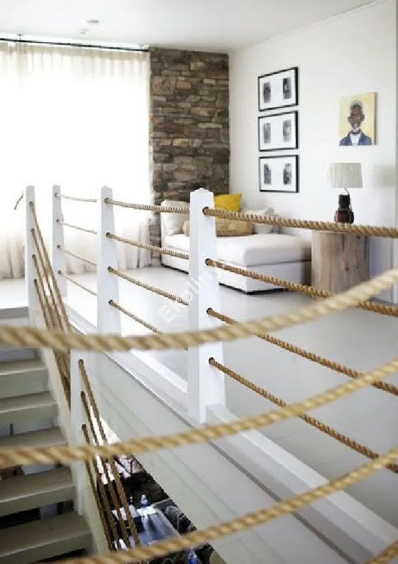 Balustrada z liny jutowej pasuje zarówno do wnętrz w stylu skandynawskim czy boho, jak i do nowoczesnych loftów. Doskonale sprawdzi się także na tarasie czy werandzie, gdzie naturalne tony juty pięknie współgrają z roślinnością i otoczeniem. -